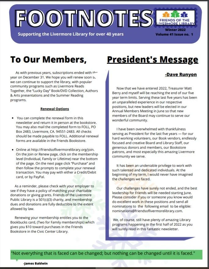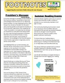 Our 40th anniversary issue! Founded in September 1978, the Friends of the Livermore Public Library have contributed over $800,000 in grants to the Livermore Library. Learn about the history of the organization through the years. The “Library Services” section tells all about how to access Your Next Great Reads.